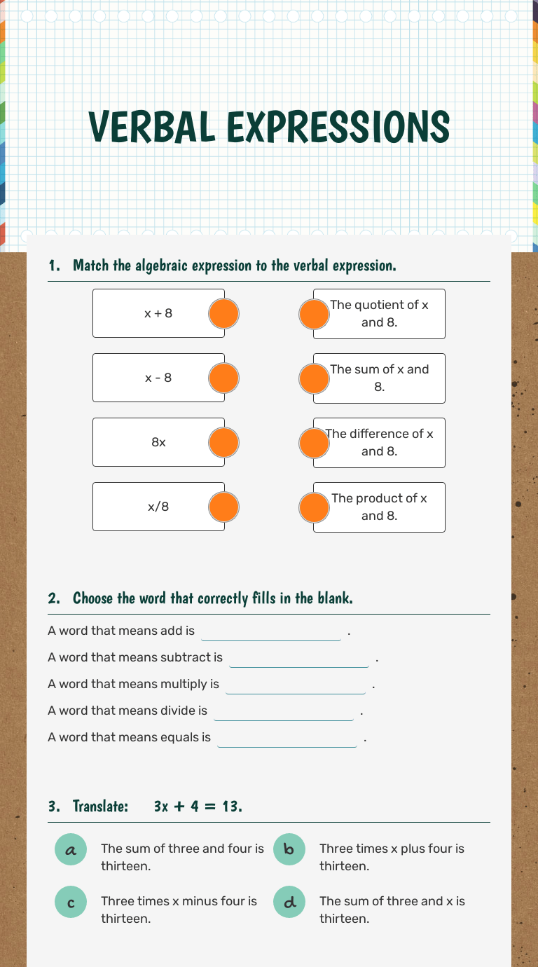 Verbal Expressions Worksheet - Translating Algebraic Phrases Simple Version A -. Students should be able read and comprehend basic math . This translate phrases worksheet will create word problems for the students to translate into an algebraic statements. This worksheet is designed to test and enrich students' knowledge about verbal expressions. Worksheet by kuta software llc. 1) the sum of x and 9.